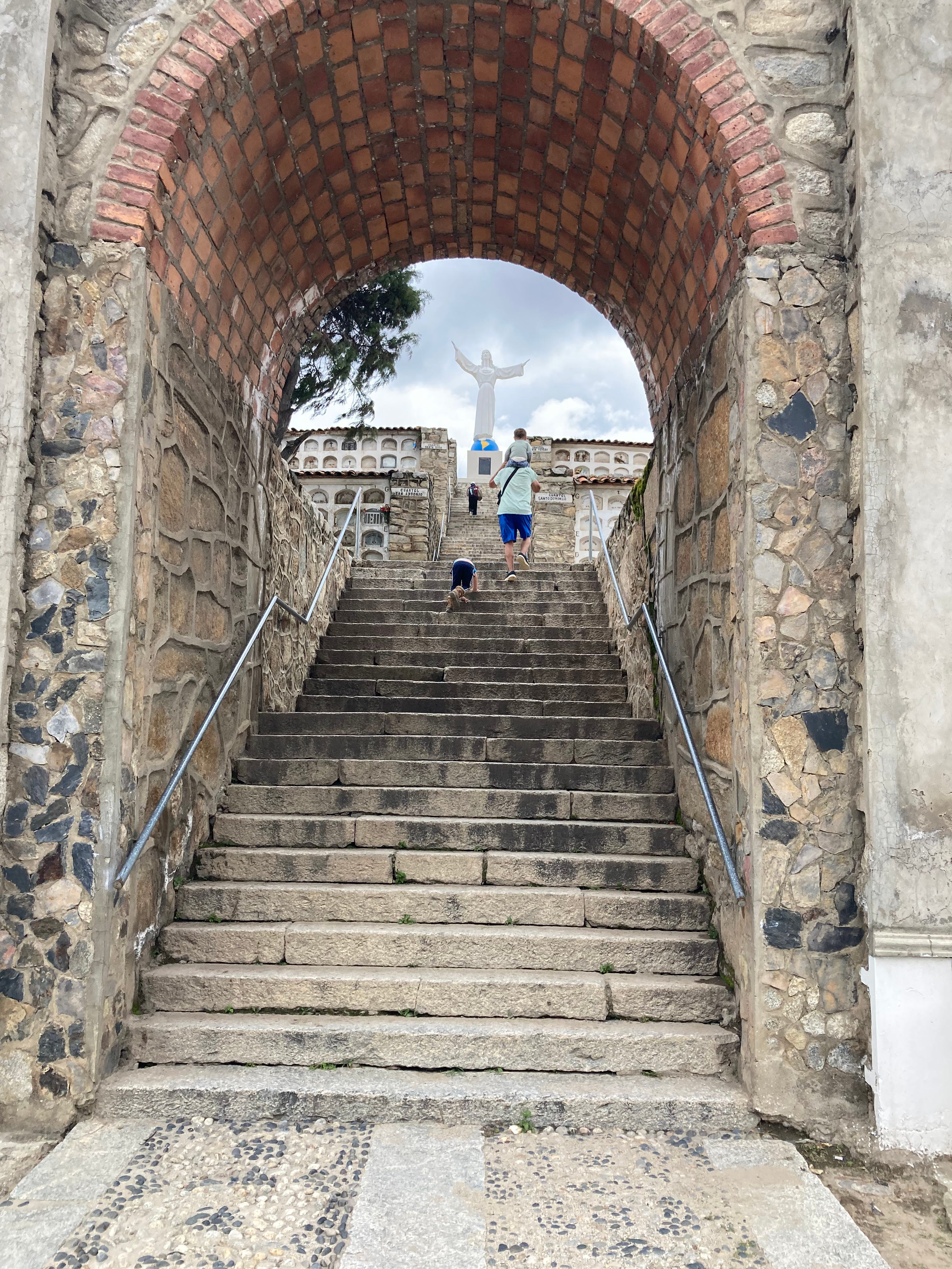 We climbed 116 stone steps to reach the top, where the Christ monument overlooks the valley at the base of Huascarán Mountain. I pulled off my hat—the wind picked up at the summit. The views were breathtaking. There were no railings, so we quickly took photos before ushering our children back down.